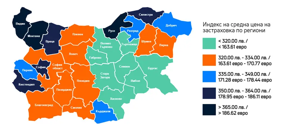 Картата на България по-долу показва отчетливо цветовото разпределение на средната цена на застраховката чрез цветови диапазони.