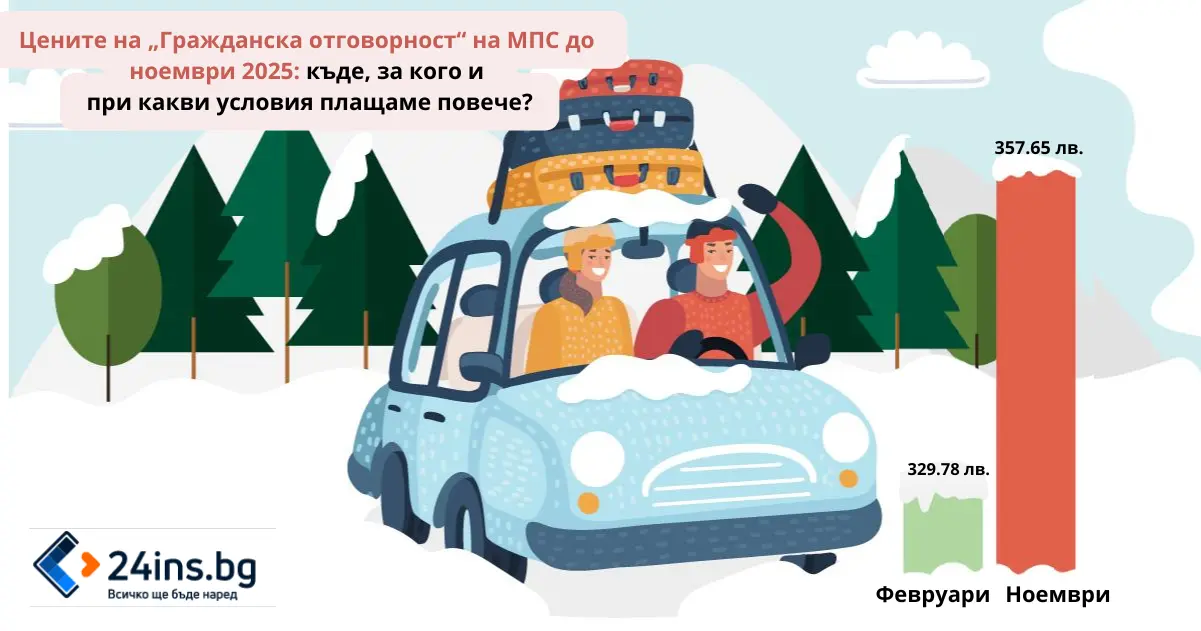 Цените на „Гражданска отговорност“ на МПС (ГО) от февруари до ноември 2025 г. очертават ясна тенденция – ноември е месецът с най-висока средна цена на полицата за периода. Средната цена за месеца достига 357.65 лв. / 182,86 евро, което е значително повишение спрямо най-ниската цена за септември, когато стойностите на премиите падат до 312.40 лв. / 159,73 евро.