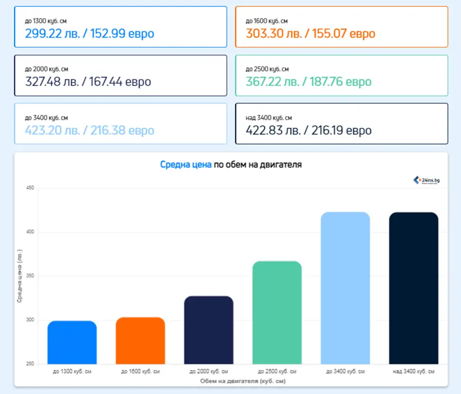 → Най-евтиният сегмент до 1 300 куб. см е с цена 299.22 лв. / 152.99 евро