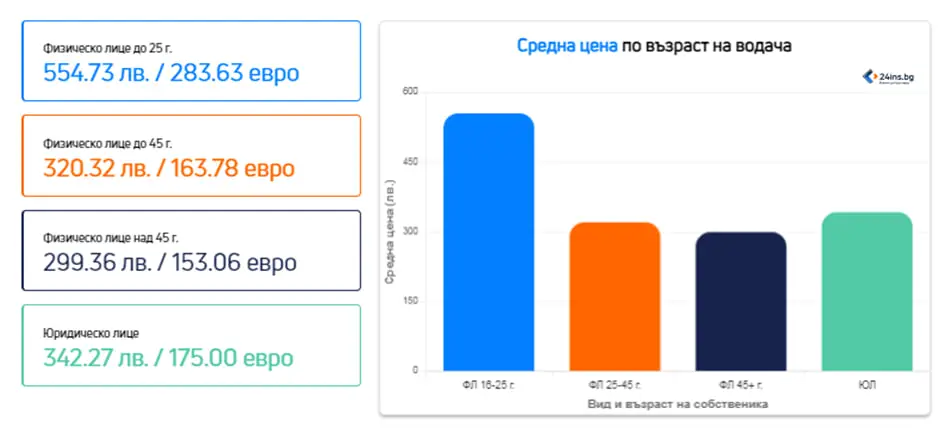 ✔Младите водачи до 25 г. плащат с 255.37 лв. повече спрямо водачите над 45 г., което представлява 85.31 % по-висока цена спрямо най-евтиния ценови профил.